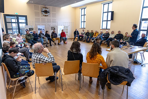 Nous sommes revenus à Soultzbach-les-Bains quelques semaines après la fin du chantier participatif pour présenter le déroulé de la résidence et recueillir les premiers retours sur le nouvel espace public. À cette occasion, nous avons accroché une bâche sur la place expliquant la démarche et proposant par des illustrations une projection de la future entrée de village.